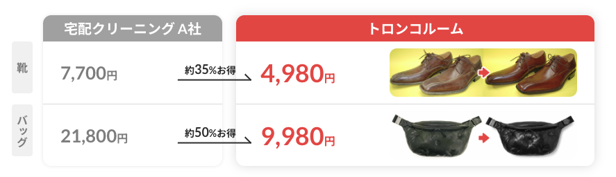 保管中にスマホ一つで申し込めるケアサービスは、トロンコルーム利用者限定の特別価格です。他社と比較して35%〜50%も安く(※当社調べ)、お気に入りの靴や服を「預けている間にプロの手でリフレッシュさせる」という賢い活用が可能です。